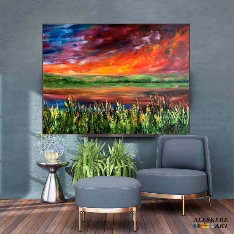 Приближающаяся гроза запечатлена в оттенках красного, желтого, синего и фиолетового, создавая атмосферу напряженного ожидания предстоящей феерической кульминации! Богряное небо отражается в бурном течении реки, добавляя картине динамизма и движения. На переднем плане яркий свет озаряет траву, высвечивая острые колоски, рассеченные небесным светом. Эта игра света и тени усиливает ощущение контраста, делая композицию еще более захватывающей и глубокой.