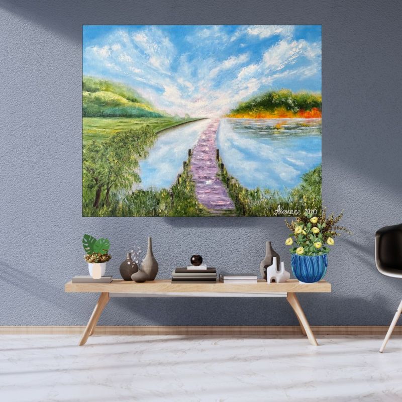 Недавняя трансформация картины добавила новые слои в облака и отражения на воде. Эти элементы стали еще более выразительными, подчеркивая гармонию между небом и землей, реальностью и мечтами. Теперь произведение излучает еще больше красоты и силы, наполняя пространство энергией творчества, любви и благодарности. Эта картина — дань моим предкам, тем, кто всегда останется в наших сердцах и воспоминаниях.
