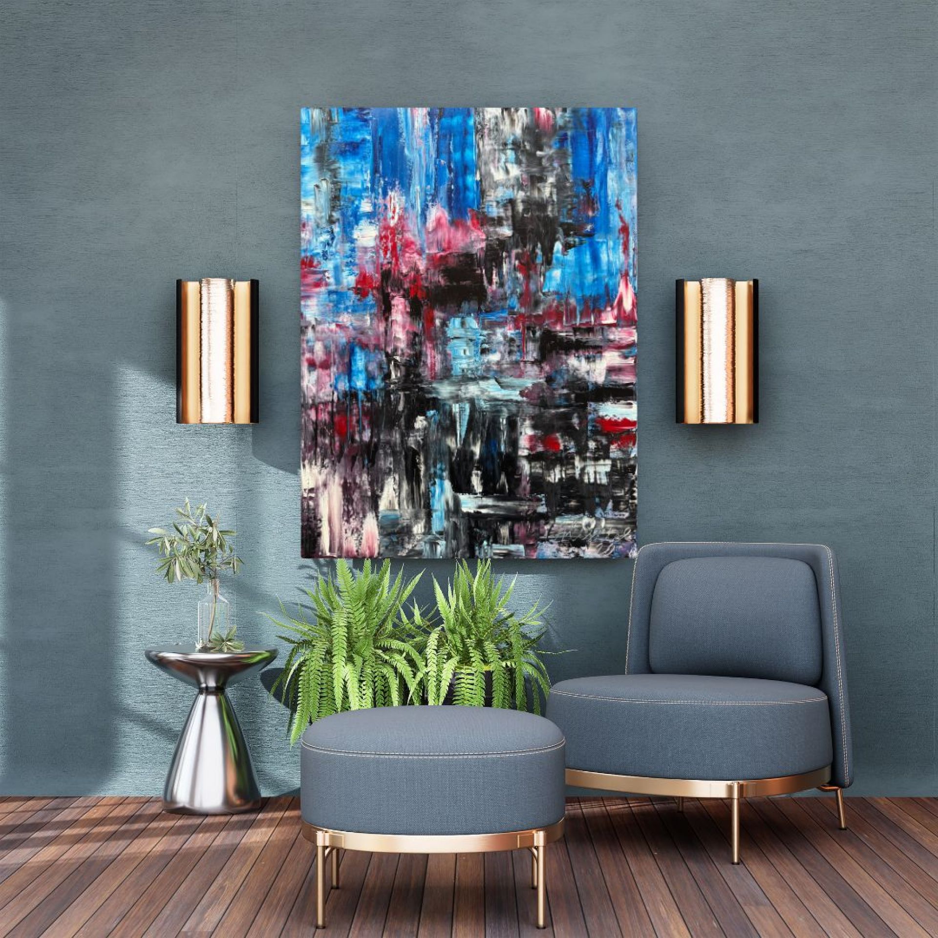 Принесите красоту Риги в ваш дом с этой абстрактной картиной, вдохновленной уникальной архитектурой города и дождливой погодой. Смелые оттенки синего, черного, белого и красного сливаются, создавая яркое изображение города. Каждый мазок кисти — это тщательно продуманный акцент, который раскрывает динамику городской жизни и атмосферу дождливого дня.